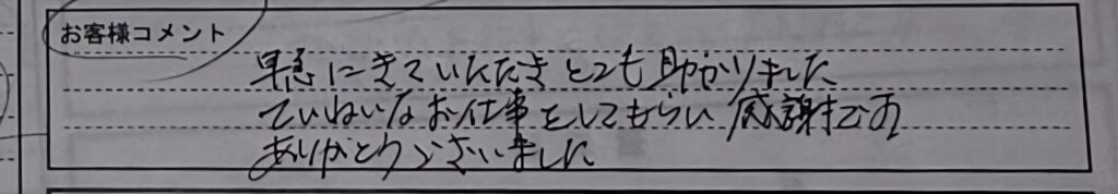 「早急に来ていただきとても助かりました。丁寧なお仕事をしてもらい感謝です。ありがとうございました。」