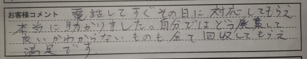 【電話してすぐその日に対応してもらえ本当に助かりました。自分ではどう廃棄して良いかわからないものもすべて回収してもらえ満足です。】