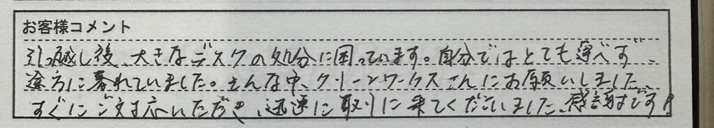 【引っ越し後大きなデスクの処分に困っています。自分ではとても運べず、途方に暮れていました。そんな中クリーンワークスさんにお願いしました。すぐにご対応いただき、迅速に取りに来てくださいました。