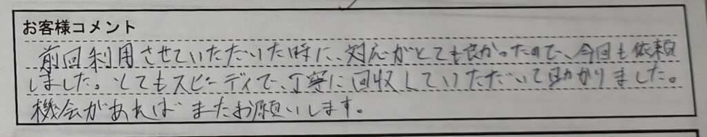 「前回利用させていただいた時に、対応がとても良かったので、今回も依頼しました。とてもスピーディで、丁寧に回収していただいて助かりました。機会があればまたお願いします。」