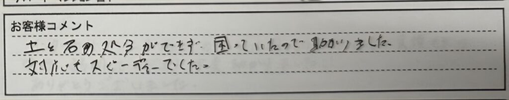 「土石の処分ができず、困ってたので助かりました。対応もスピーディーでした。」