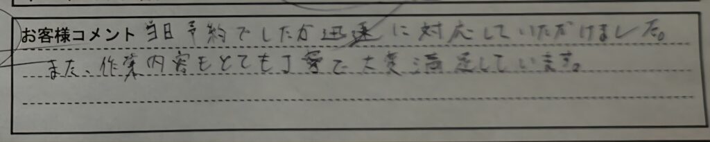 「当日予約でしたが迅速に対応していただきました。また作業内容もとても丁寧で大変満足しています。」